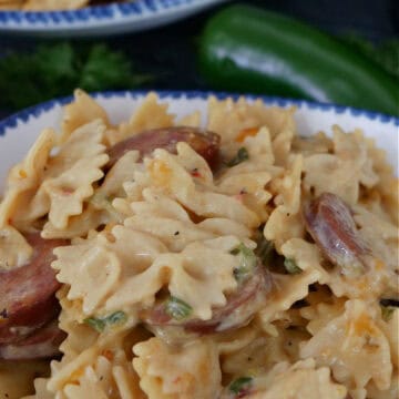 This cheesy smoked sausage bow tie pasta is the perfect dish for weeknight dinners or get-togethers. With smoky sliced kielbasa, tender bow tie pasta, a rich, creamy cheddar sauce and a big punch of seasonings make this a meal that leaves you with no doubt that you’ve had a real meal!