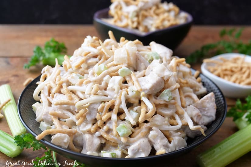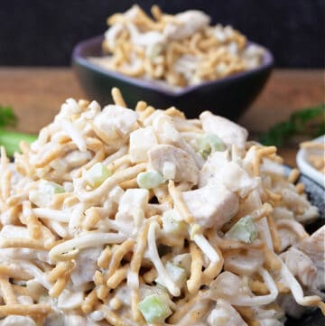 This chicken salad is loaded with all the flavor and texture we love in chicken salad, but it has an extra tasty Asian twist that I can’t get enough of. Tender, white meat chicken is combined with celery, onions, bean sports, water chestnuts, chow mein noodles, and zesty seasoning. Then, it’s all combined with a creamy Asian-infused mayonnaise dressing that delivers a delicious blast of American-Asian fusion flavor that everyone always loves. It’s a delicious main course or side for any big party.