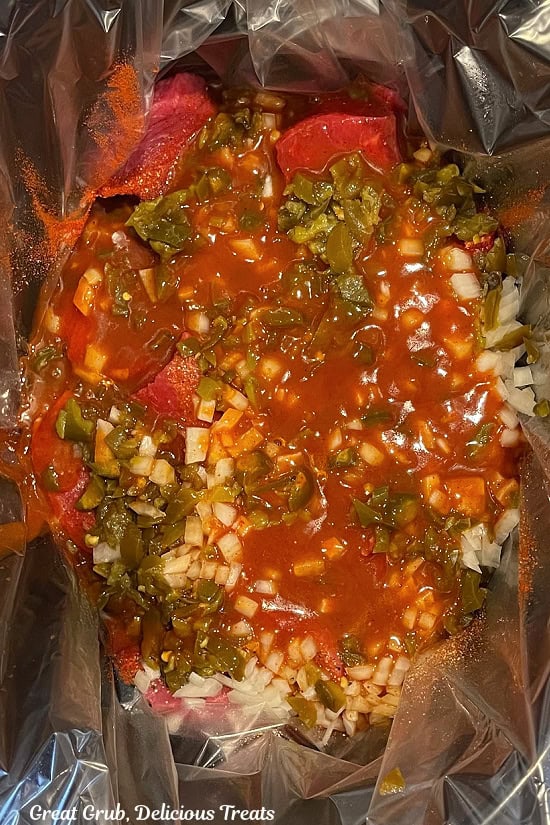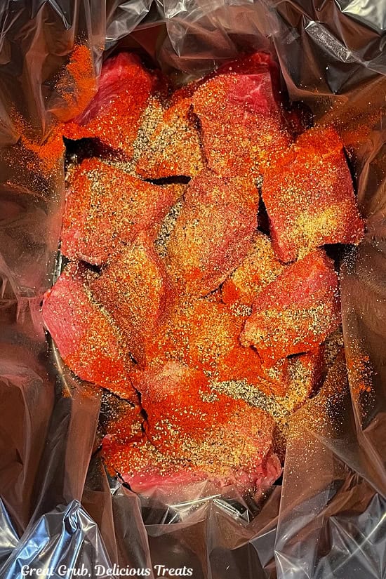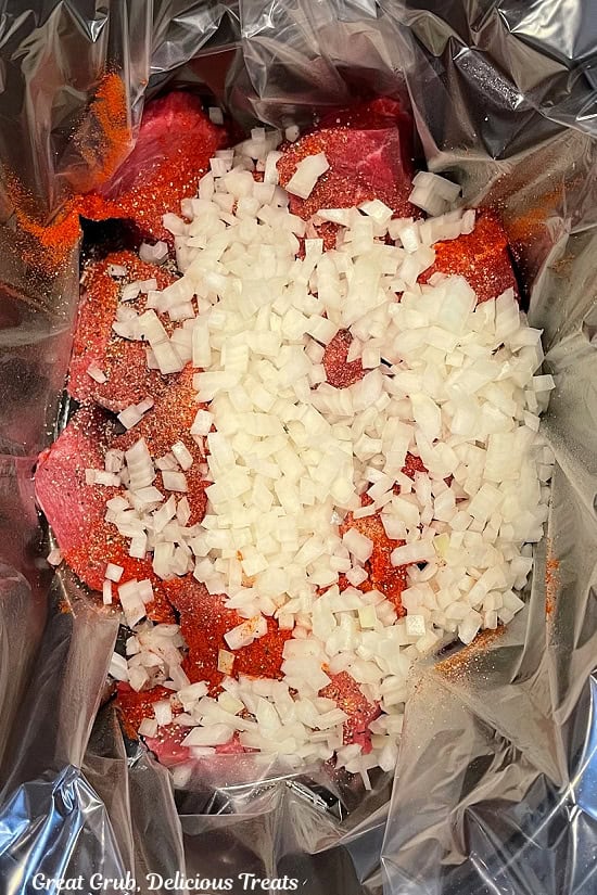Add beef to a lined 6-8 quart crock pot or spray with non-stick cooking spray.