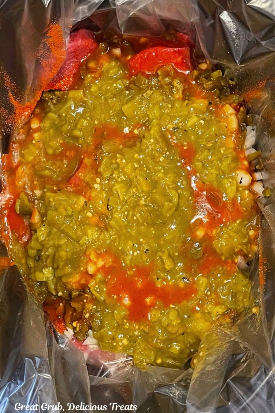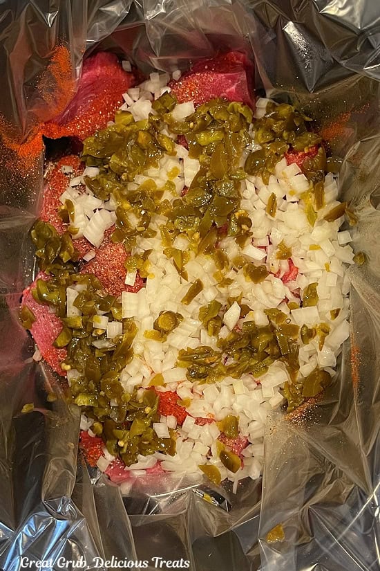 2: Add the meat, seasonings, onions, jalapenos, enchilada sauce, and salsa.