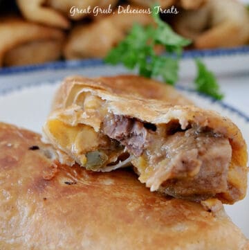 These delicious fried burritos are so good fresh or even reheated from frozen. They’re easy to make and even easier to serve because they’re a complete meal in and of themselves. They’re packed with beef, pork, beans, and more, and they incredibly hearty.
