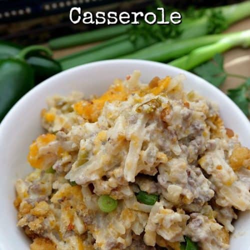 This delicious casserole starts with browned ground beef, tender onions, and fragrant garlic. Then, I mix it with diced tomatoes, enchilada sauce, beans, and corn. Finally, I add rice and simmer until it’s tender, top with shredded cheddar cheese, and serve. It’s an easy recipe that only takes about 20 minutes from start to finish, and it makes a great weeknight meal or addition to any potluck. If you have a big family, you can enjoy it for a couple of days. If you don’t you can enjoy it even longer or refrigerate the leftovers!