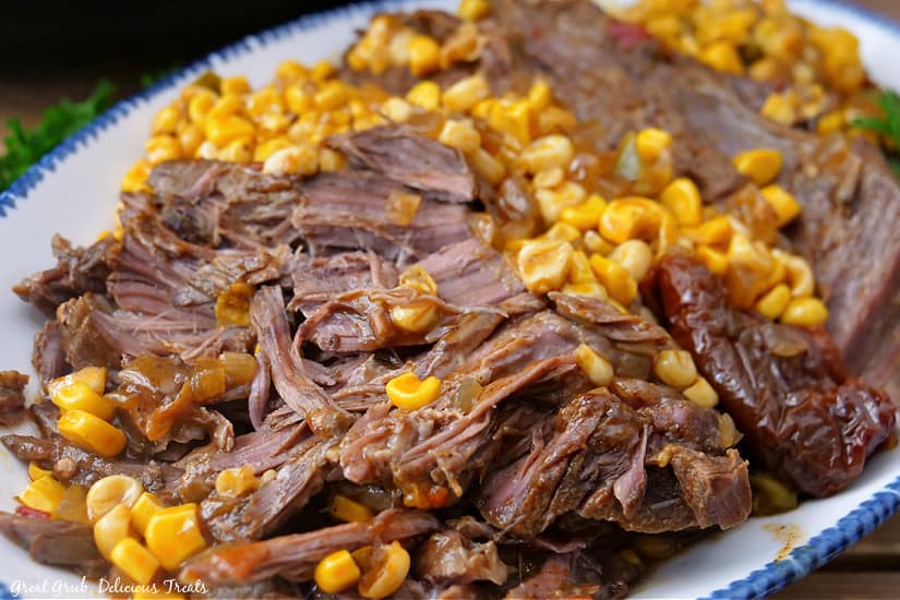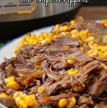 This is one of the best pot roasts you’ll ever make if you like to keep things zesty and interesting. It starts with a nice, beefy chuck roast with tons of great marbling to get that tender, juicy, shredded texture. Then, I add onions, pepper, southwestern corn, and some favorite Tex-Mex ingredients like chipotle peppers and enchilada sauce to create a sweet, spicy, kicked-up chuck roast that satisfies everyone. It’s delicious served over rice or mashed potatoes, alongside your favorite vegetables, or added to tacos, burritos, and more as leftovers.