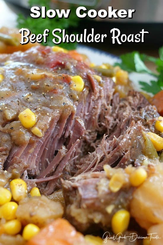 Super tender, this slow cooker beef shoulder roast is an incredibly delicious comfort food that has been a family favorite for years. Having tender beef mixed with creamy, soft potatoes and delicious carrots, along with other veggies, makes dinner delicious. Using the slow cooker or crock pot is perfect for this roast and veggies because all that needs to be done is peeling and slicing the vegetables, seasoning the meat, putting everything together in the slow cooker, turning it on and no fuss, just great food without any hassle.