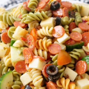 This delicious pasta salad is made with Italian dressing instead of a heavy, creamy sauce. It combines tri-color rotini, pepperoni, mozzarella cheese, cucumbers, grape tomatoes, and black olives with the dressing I just mentioned to create a light pasta salad that’s big on Italian flavor but not on work and that will leave you feeling like you’ve got just a little more room for that other delicious dish you saw on the potluck table. Don’t stop at potlucks, though. I’ve been known to make this pasta salad simply to go with family dinner.